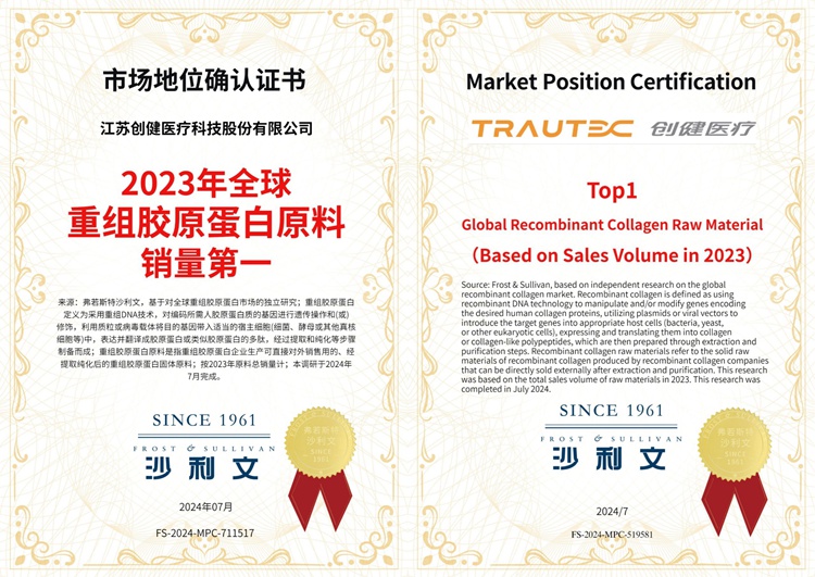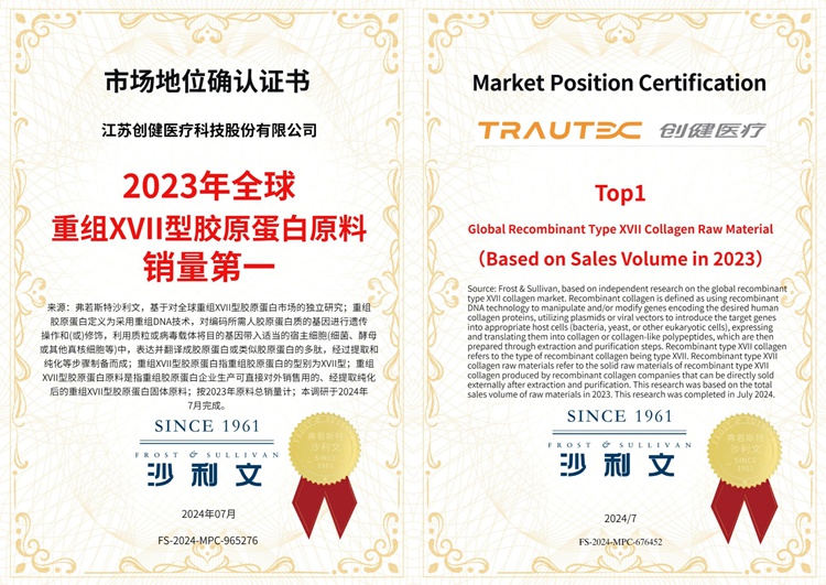 日前,经知名咨询机构弗若斯特沙利文认证,创健医疗获得“2023年全球重组胶原蛋白销量第一”及“2023年全球重组XVII型胶原蛋白原料销量第一”两大全球市场地位确认证书,彰显了创健医疗在重组胶原蛋白行业的领先地位与强劲产品实力。